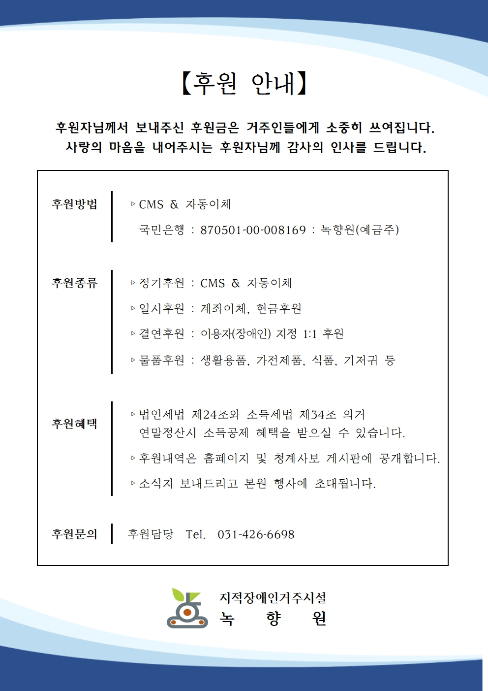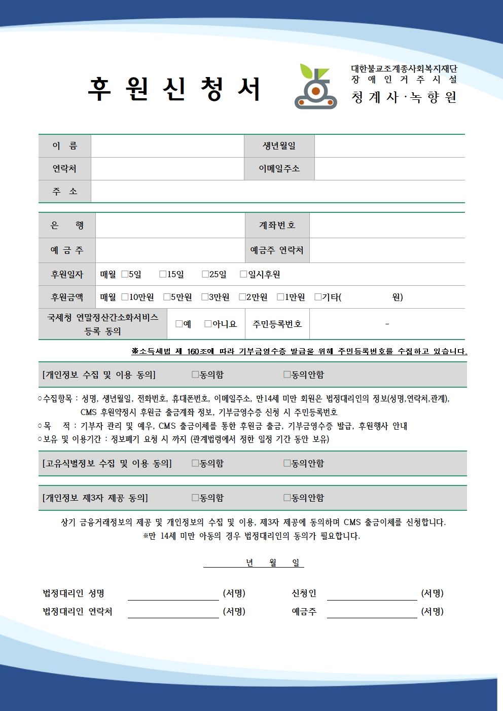 후원신청서(양식) 페이지 정보 작성자 관리자 작성일2026.01.01 조회30회 댓글0건 첨부파일 녹향원_후원신청서.pdf (107.7K) 0회 다운로드 관련링크 본문 이전글 다음글 목록