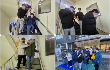 ○ 진행일자: 2026년 2월 25일 수요일 ○ 진행장소: 녹향원 마당○ 진행내용 2월 25일, 녹향원에서는 소방대피훈련을 실시하였다. 이번 훈련에는 모든 이용자와 전 직원이 참여하였다. 소방대피훈련 시에는 승강기 사용이 제한되므로, 보행에 어려움이 있는 이용자에 대해서는 직원이 업거나 부축하는 방식으로 안전한 이동을 지원하였다. 화재와 같은 안전사고는 무엇보다 예방이 최선이지만, 만일의 상황에 대비하는 것 또한 매우 중요하