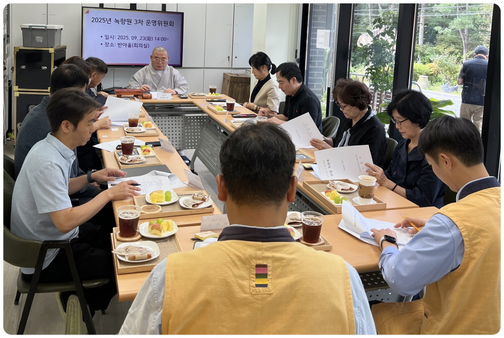2025년 9월 23일 화요일 오후 2시, 녹향원에서는 2025년도 제3차 운영위원회가 진행되었다. 이번 회의에서는 이용자 현황, 종사자 현황, 이용자 금전 사용 내역, 장기 입원자 현황, 업무 협약에 대한 내용을 중심으로 논의하였다. 2025년도 이용자 현황 보고를 통해 생활실 구성과 변동사항을 공유하고, 종사자 현황을 바탕으로 인력 배치와 업무 분장을 점검하였다. 이용자 금전 사용 내역을 확인하며 투명한 관리체계를 유지하고, 장기 입원자 현황을 검토하여 개별 지원 방향을 논의하였다. 또한 최근 체결된 업무 협약 내용을 공유하며 기관 간 협력과 지역사회 연계 강화를 위한 의견을 나누었다. 이번 운영위원회를 통해 기관 운영의 주요 현황을 점검하고 향후 개선과제를 함께 논의하는 시간을 가졌다.