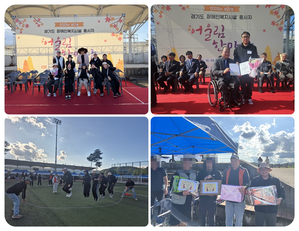 2025년 10월 23일, 경기도 양평군 개군레포츠공원에서 경기도장애인복지시설 종사자 어울림한마당이 열렸다. 이번 행사는 도내 장애인복지시설 종사자들의 화합과 소통을 위해 마련되었으며, 유공자 표창과 함께 이벤트 프로그램, 마음나누기, 시설대항 줄넘기 등이 진행되었다. 녹향원에서는 김나현 원장을 비롯해 10명의 직원이 참여했다. 특히 오영근 사회복지사가 장기근속과 장애인 복지 향상에 기여한 공로를 인정받아 **한국장애인복지시설협회장상(표창장)**을 수상했다. 녹향원은 이용자 뿐 아니라 직원들에게도 의미 있는 시간을 제공하기 위해, 앞으로도 직원 교류와 힐링을 위한 다양한 외부활동을 지속적으로 추진할 예정이다.